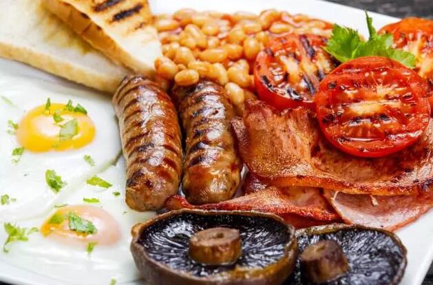 一般来说传统的英式早餐包含有培根,蛋,土豆,蘑菇,面包,黄油,香肠,黑布丁,豆子,马铃薯和洋白菜还有薯饼也会包含其中。是不是超级丰盛呢?