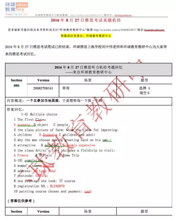 环球教育教研中心的老师此次为大家来“2016年8月27日雅思听力考试真题回忆+答案”,希望对大家有所帮助。
