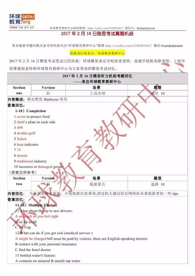 以上就是由环球教育教研中心一线名师们为同学们整理的2017年2月16日最新雅思听力考试机经及答案的全部内容,更多雅思机经下载、雅思试题、雅思备考复习计划、雅思培训以及雅思考试技巧等相关信息请持续关注环球教育雅思频道!