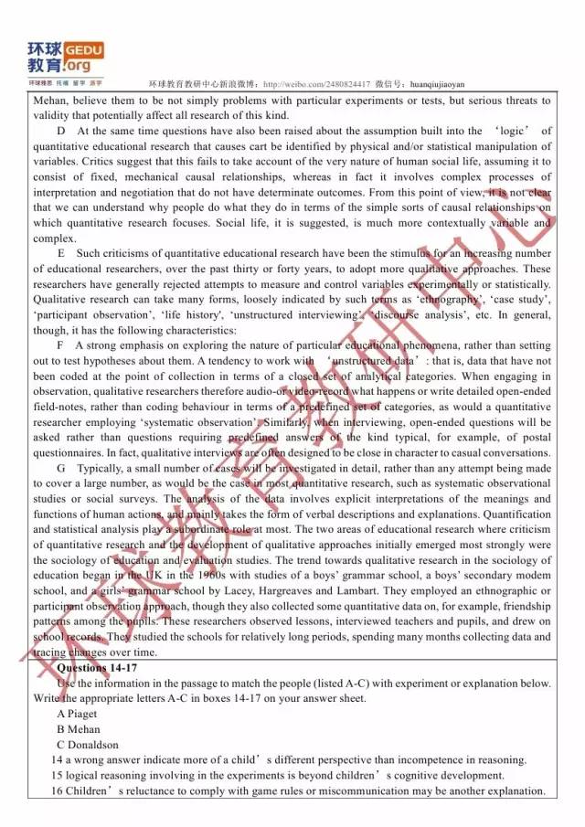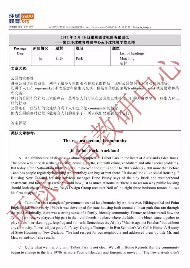 以上就是由环球教育教研中心一线名师们为同学们整理的2017年2月16日最新雅思阅读考试机经及答案的全部内容,更多雅思机经下载、雅思考试、雅思备考复习计划、雅思培训以及雅思考试技巧等相关信息请持续关注环球教育雅思频道!