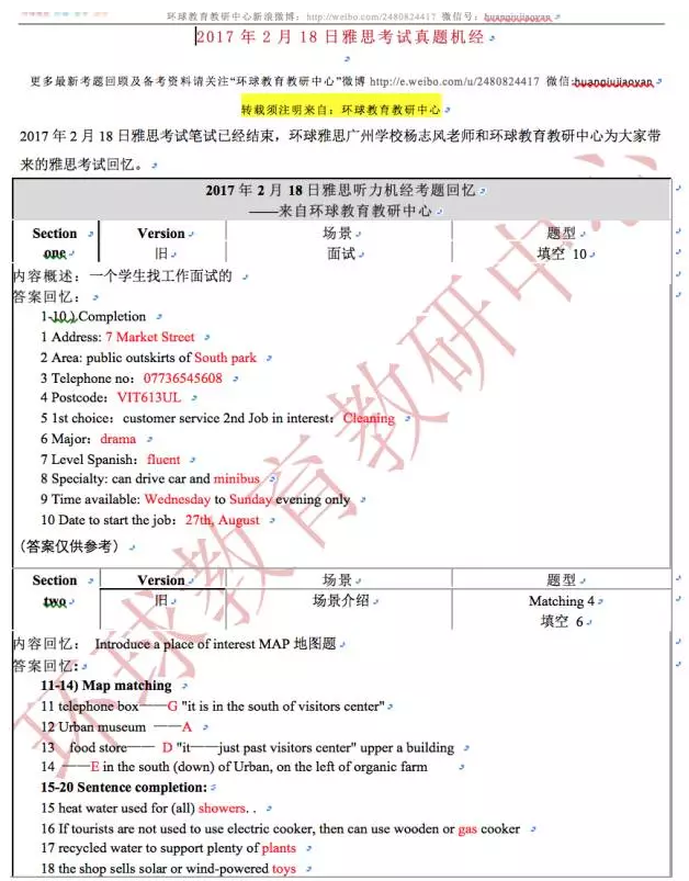 环球教育(原环球教育)教研中心的名师们此次为大家送上2017年2月18日雅思听力考试回忆及答案,希望能够对大家雅思备考有所帮助!