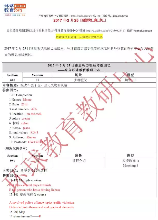 环球教育(原环球教育)教研中心的名师们此次为大家送上2017年2月25日雅思听力考试回忆及答案,希望能够对大家雅思备考有所帮助!