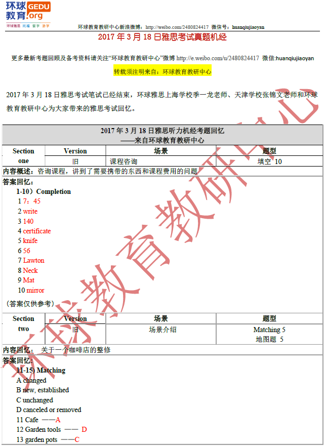 环球教育(原环球教育)教研中心的名师们此次为大家送上2017年3月18日雅思听力考试回忆及答案,希望对大家备考雅思有所帮助!
