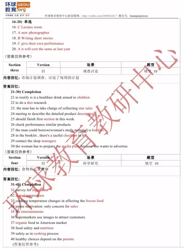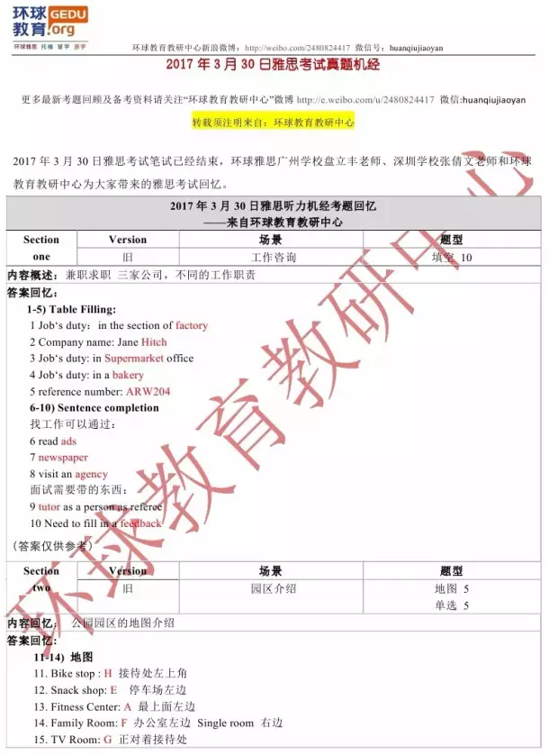 环球教育(原环球教育)教研中心的名师们此次为大家送上2017年3月30日雅思听力考试回忆及答案,希望对大家备考雅思有所帮助!