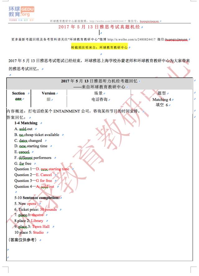 以上就是由环球教育教研中心一线名师们为同学们整理的2017年5月13日最新雅思听力考试机经及答案的全部内容,更多雅思机经下载、雅思试题、雅思备考复习计划、雅思培训以及雅思考试技巧等相关信息请持续关注环球教育雅思频道!