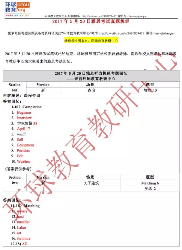 环球教育(原环球教育)教研中心的名师们此次为大家送上2017年5月20日雅思听力考试回忆及答案,希望对大家备考雅思有所帮助!