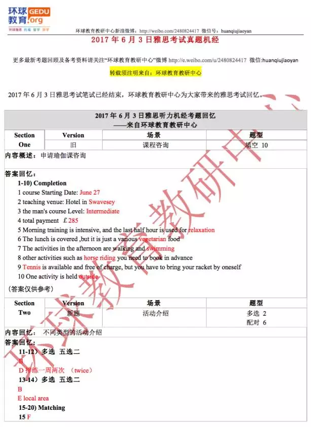 环球教育(原环球教育)教研中心的名师们此次为大家送上2017年6月3日雅思听力考试回忆及答案,希望对大家备考雅思有所帮助!