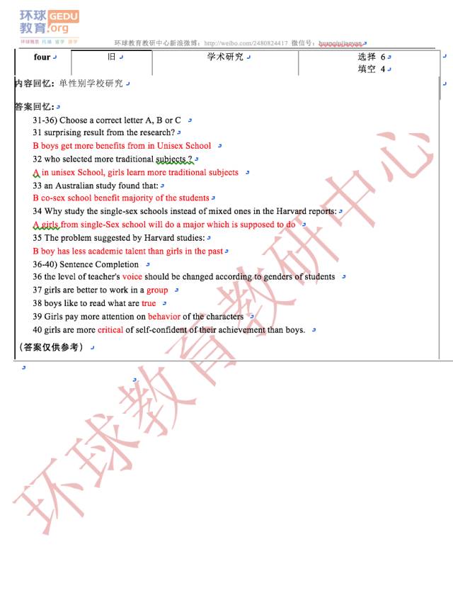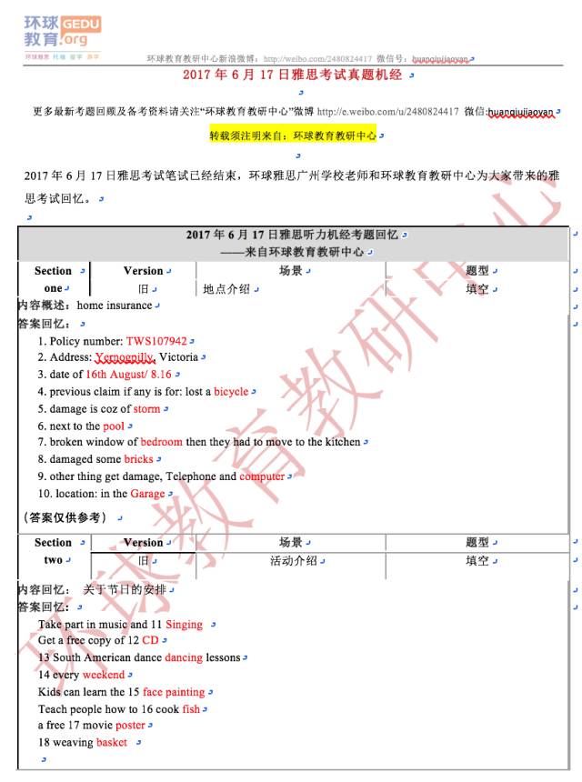 以上就是由环球教育教研中心一线名师们为同学们整理的2017年6月17日最新雅思听力考试机经及答案的全部内容,更多雅思机经下载、雅思试题、雅思备考复习计划、雅思培训以及雅思考试技巧等相关信息请持续关注环球教育雅思频道!