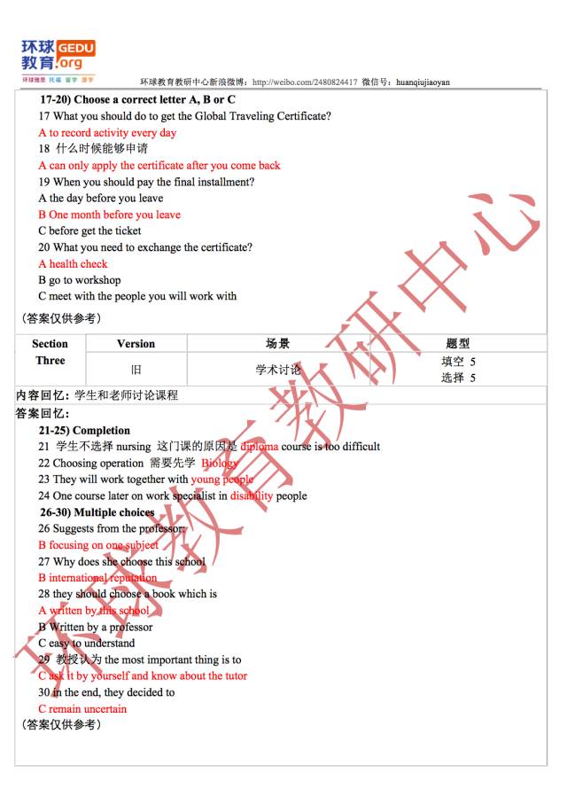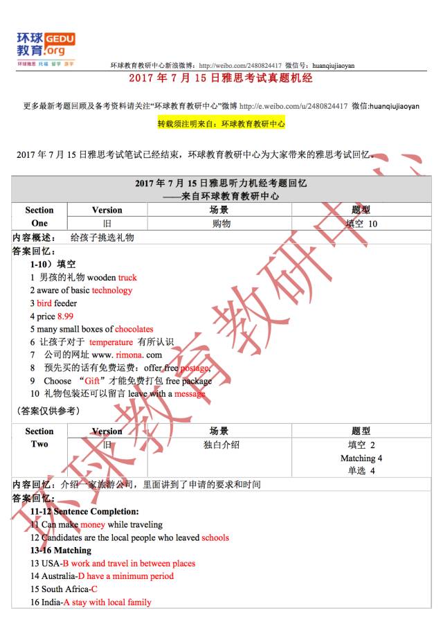 以上就是由环球教育教研中心一线名师们为同学们整理的2017年7月15日最新雅思听力考试机经及答案的全部内容,更多雅思机经下载、雅思试题、雅思备考复习计划、雅思培训以及雅思考试技巧等相关信息请持续关注环球教育雅思频道!
