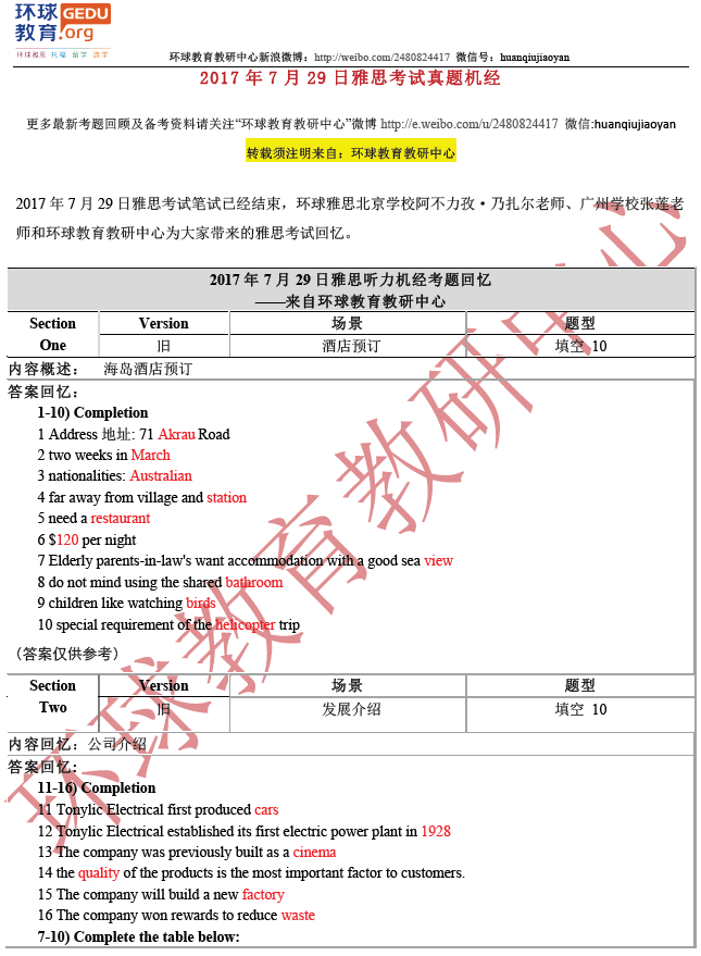 环球教育教研中心的名师们此次为大家送上2017年7月29日雅思听力考试回忆及答案,希望对大家备考雅思有所帮助!