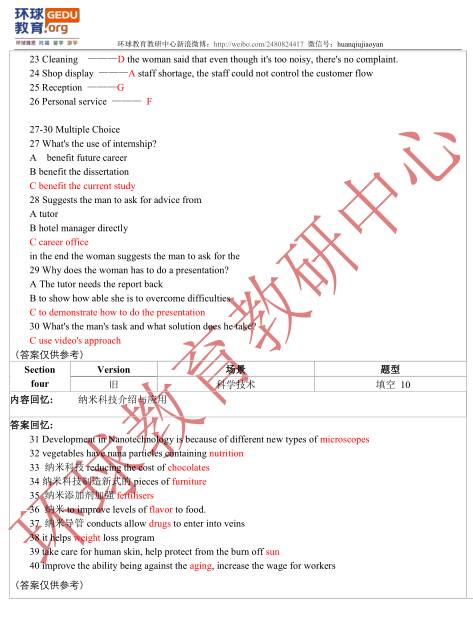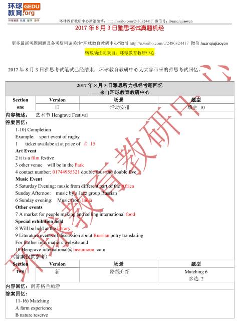 以上就是由环球教育教研中心一线名师们为同学们整理的2017年8月3日最新雅思听力考试机经及答案的全部内容,更多雅思机经下载、雅思试题、雅思备考复习计划、雅思培训以及雅思考试技巧等相关信息请持续关注环球教育雅思频道!