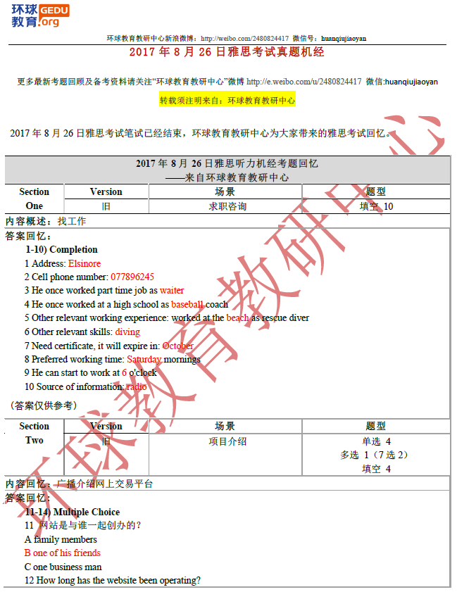 环球教育教研中心的名师们此次为大家送上2017年8月26日雅思听力考试回忆及答案,希望对大家备考雅思有所帮助!