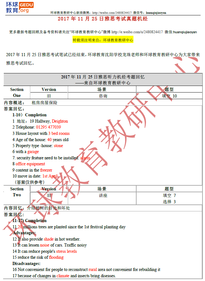 环球教育教研中心的名师们此次为大家送上2017年11月25日雅思听力考试回忆及答案,希望对大家备考雅思有所帮助!