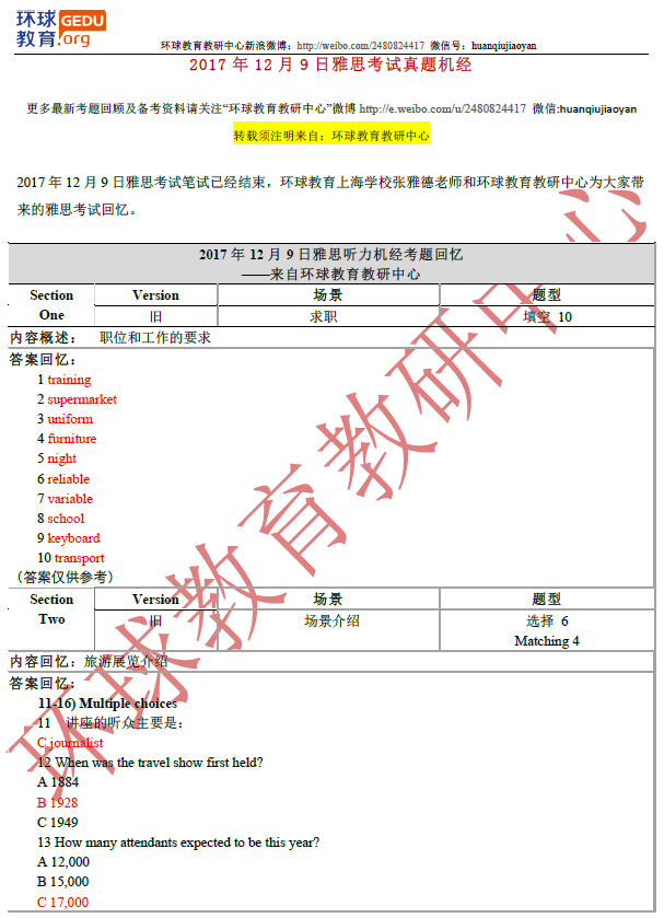 环球教育教研中心的名师们此次为大家送上2017年12月9日雅思听力考试回忆及答案,希望对大家备考雅思有所帮助!