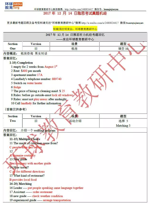 环球教育教研中心的名师们此次为大家送上2017年12月14日雅思听力考试回忆及答案,希望对大家备考雅思有所帮助!