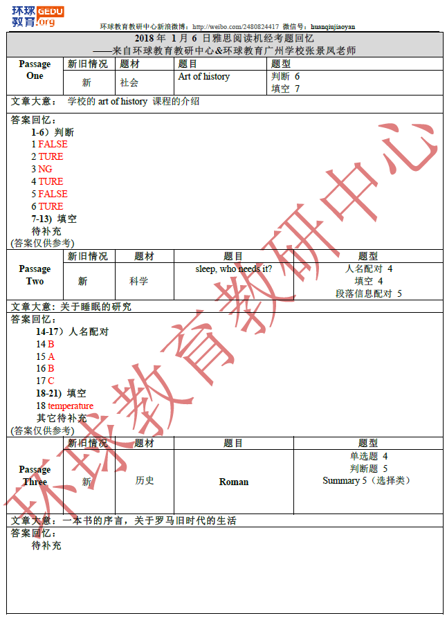 环球教育教研中心的名师们此次为大家送上2018年1月6日雅思阅读考试回忆及答案,希望对大家备考雅思有所帮助!