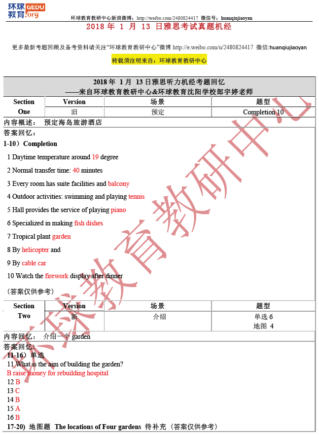 环球教育教研中心的名师们此次为大家送上2018年1月13日雅思听力考试回忆及答案,希望对大家备考雅思有所帮助!