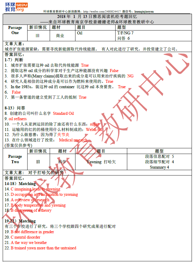 环球教育教研中心的名师们此次为大家送上2018年1月13日雅思阅读考试回忆及答案,希望对大家备考雅思有所帮助!