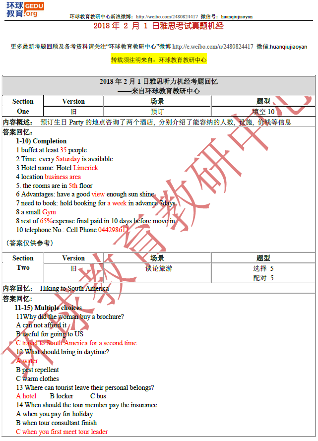 环球教育教研中心的名师们此次为大家送上2018年2月1日雅思听力考试回忆及答案,希望对大家备考雅思有所帮助!