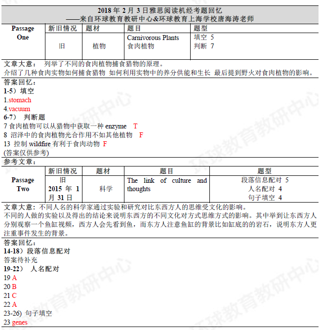 环球教育教研中心的名师们此次为大家送上2018年2月3日雅思阅读考试回忆及答案,希望对大家备考雅思有所帮助!