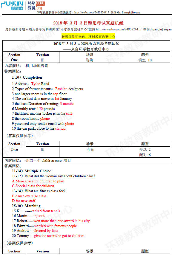 环球教育教研中心的名师们此次为大家送上2018年3月3日雅思听力考试回忆及答案,希望对大家备考雅思有所帮助!