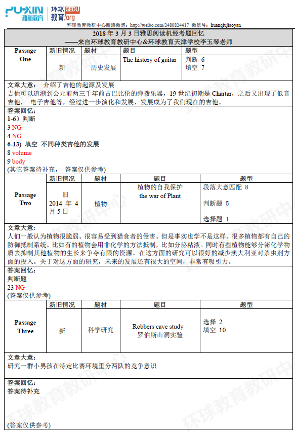 环球教育教研中心的名师们此次为大家送上2018年3月3日雅思阅读考试回忆及答案,希望对大家备考雅思有所帮助!