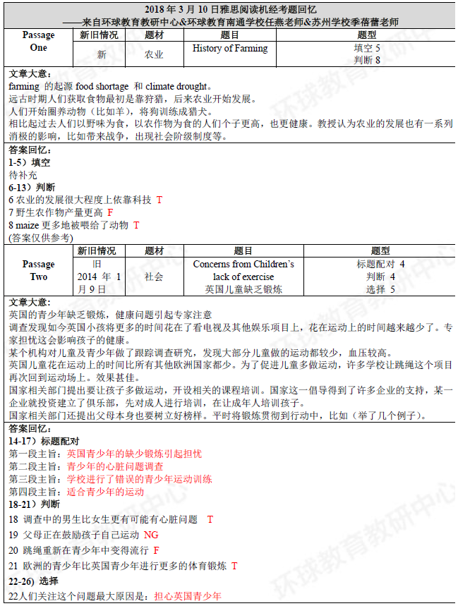 环球教育教研中心的名师们此次为大家送上2018年3月10日雅思阅读考试回忆及答案,希望对大家备考雅思有所帮助!