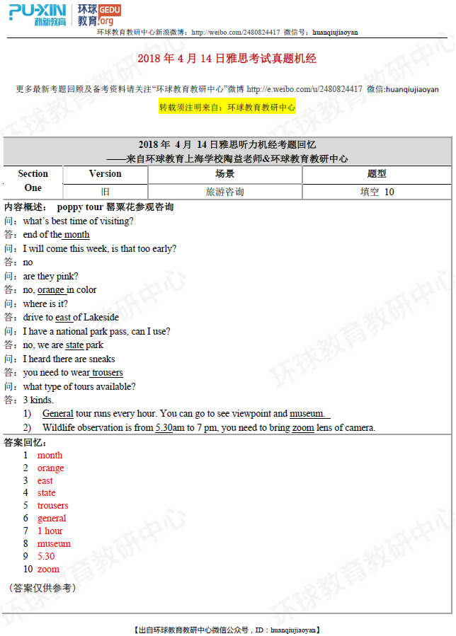 环球教育教研中心的名师们此次为大家送上2018年4月14日雅思听力考试回忆及答案,希望对大家备考雅思有所帮助!
