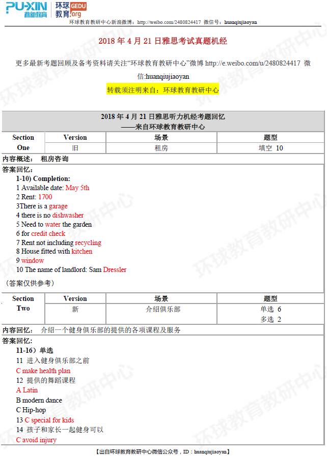 环球教育教研中心的名师们此次为大家送上2018年4月21日雅思听力考试回忆及答案,希望对大家备考雅思有所帮助!